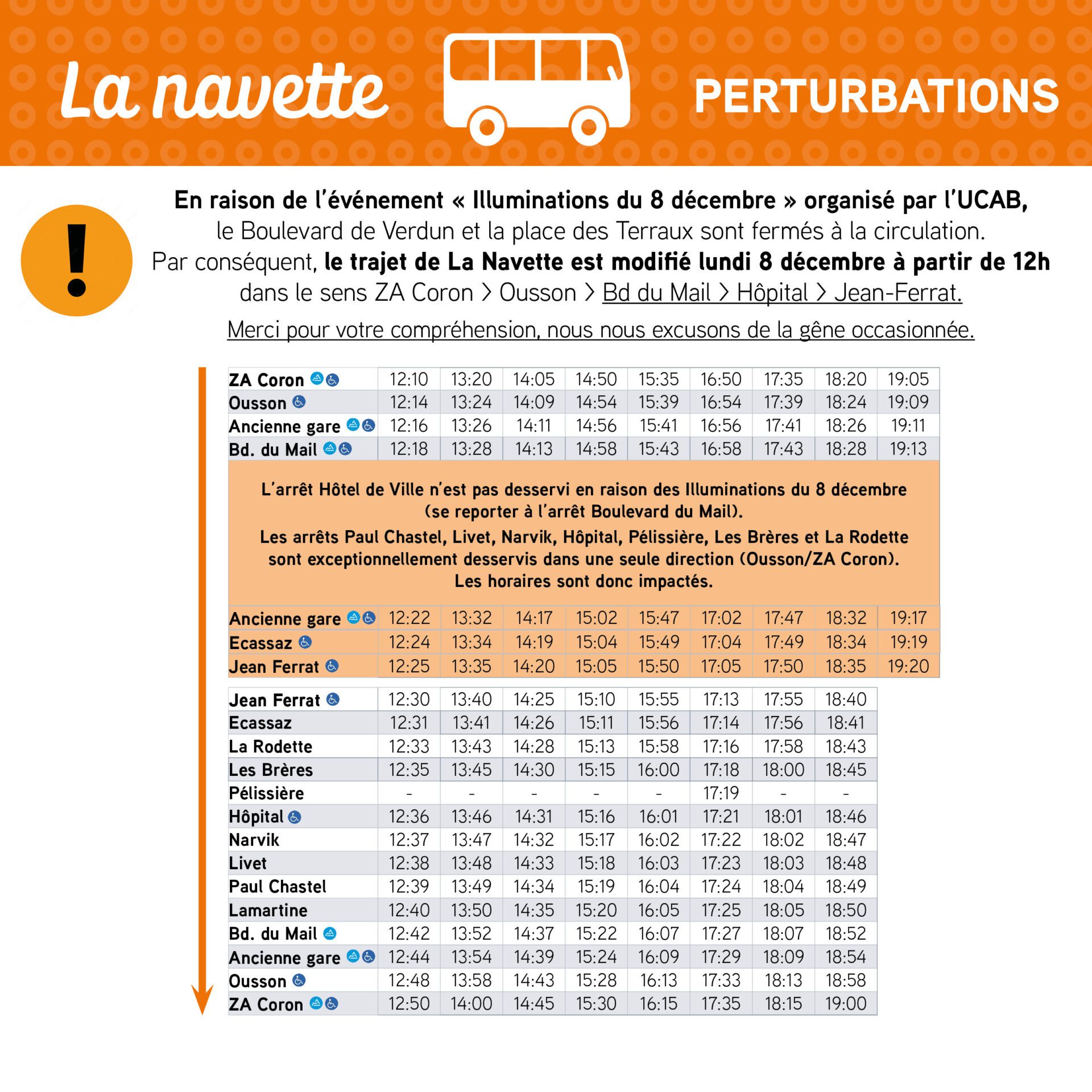 En raison de la fermeture à la circulation du Boulevard de Verdun et de la Place des Terreaux (illuminations du 8 décembre), le trajet de la Navette sera modifié le lundi 8 décembre de 12h00 à 19h30 dans le sens Bd. du Mail > Hôpital > Jean Ferrat uniquement.