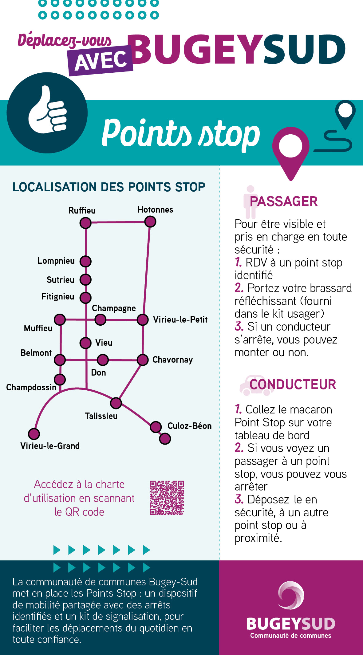 Pour faciliter les déplacements du quotidien, la communauté de communes Bugey-Sud a mis en place un réseau de 17 Points Stop dans le Valromey et vers des destinations clés (gare de Culoz-Béon, gare de Virieu-le-Grand).